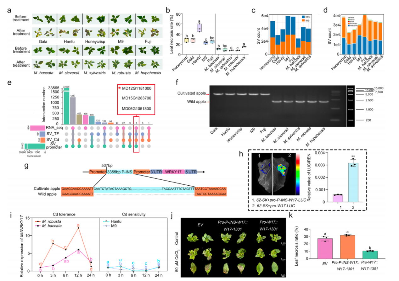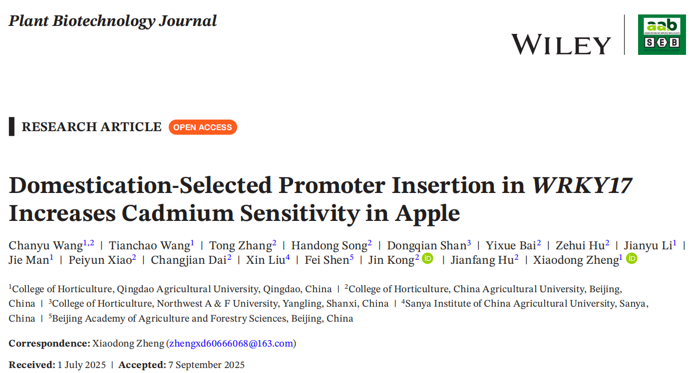 近日,beat365亚洲体育官方网站果树生物技术与种质创新团队联合中国农业大学和北京农林科学院生物技术研究所在Plant Biotechnology Journal上发表了题为“Domestication-selected Promoter Insertion in WRKY17 Increases Cadmium Sensitivity in Apple”的研究论文,系统揭示了栽培苹果与野生苹果在镉抗性方面差异的分子机制。该研究指出,转录因子WRKY17启动子区的一个自然变异插入是导致两者抗镉能力差异的关键因素,并深入解析了WRKY17参与镉胁迫应答的新机制。