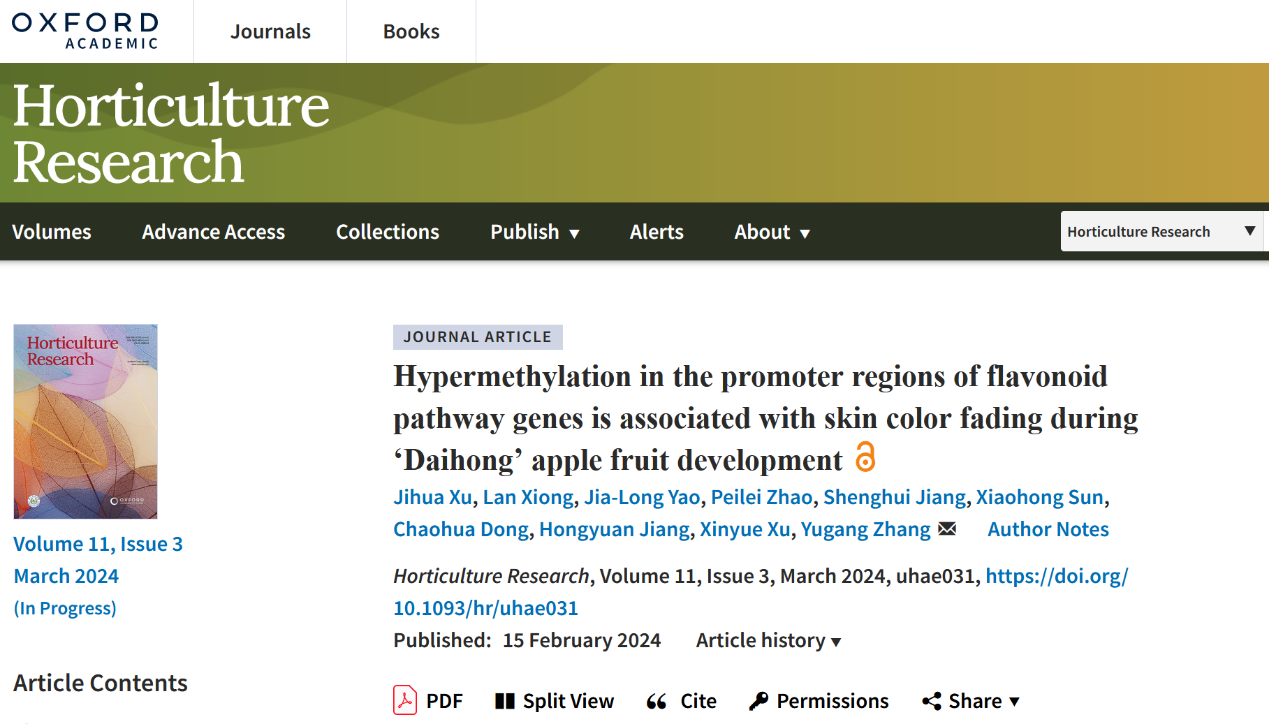 近日,beat365亚洲体育官方网站张玉刚教授团队在中科院一区Top期刊Horticulture Research发表题为Hypermethylation in the promoter regions of flavonoid pathway genes is associated with skin color fading during ‘Daihong’ apple fruit development的研究论文。该研究以beat365亚洲体育官方网站苹果育种团队选育的R1R6型红肉苹果品种‘黛红’为试材,结合遗传背景分析、代谢物分析、转录组、甲基化组及分子生物学手段解析了DNA甲基化参与苹果果皮褪色的机理。
