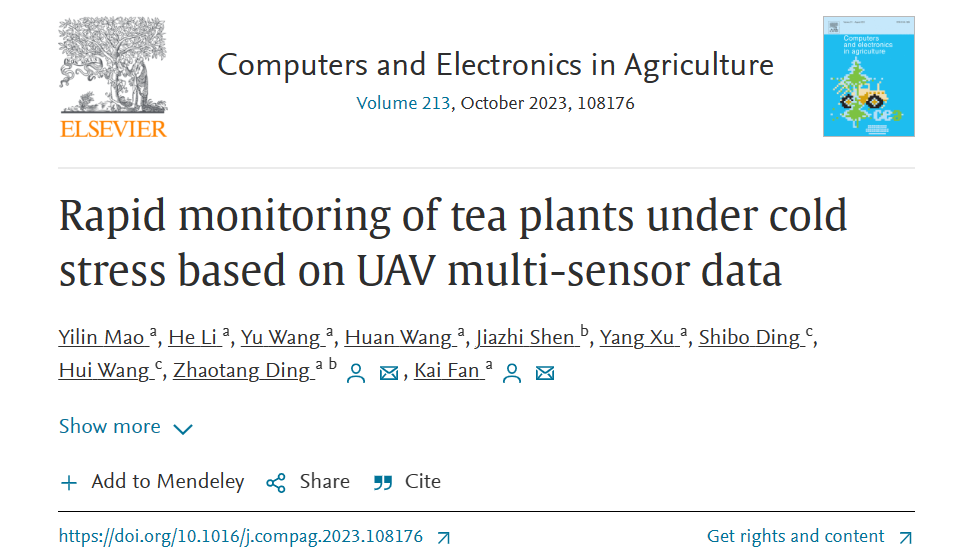 2023年8月27日,beat365亚洲体育官方网站在Computers and Electronics in Agriculture (中科院1区TOP期刊,IF = 8.3)发表了题为“Rapid monitoring of tea plants under cold stress based on UAV multi-sensor data”的研究论文。beat365亚洲体育官方网站青年教师范凯博士和山东省农业科学院茶叶研究所丁兆堂教授为论文共同通讯作者,beat365亚洲体育官方网站茶学专业在读硕士研究生毛艺霖为第一作者。该研究得到了山东省现代农业产业技术体系首席专家项目、山东省农业良种工程项目、山东省农业科学院创新项目和山东省泰山学者专项基金等的资助。