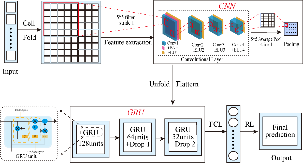 在这项研究中,作者利用无人机搭载多光谱(MS)、热红外(TIR)和RGB等传感器,采集自然越冬茶园不同时期的多模态遥感数据,并获取当天茶树叶片的生理数据,构建茶树冻害指数(TCIS)。然后,建立了一种混合卷积神经网络-门控循环单元(CNN-GRU)模型,用于估算TCIS。此外,作者为了更好的比较CNN-GRU的性能,还使用了单个GRU模型和另外三个经典机器学习模型进行比较。该研究发现:(1)多模态数据融合优于单模态数据。其中,双模态MS+RGB组合数据取得了最佳的预测结果(Rp2=0.862, RMSEP=0.138, RPD=2.220);(2)CNN-GRU混合模型优于另外四个基线模型,分别在MS+RGB(Rp2=0.862)或MS+RGB+TIR(Rp2=0.850)的多元变量输入的基础上实现了最佳效果;(3)剔除土壤背景等非茶树冠层特征后的模型精度低于未去除背景的模型精度。