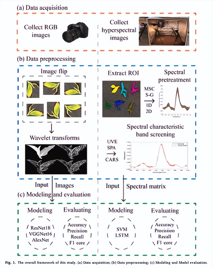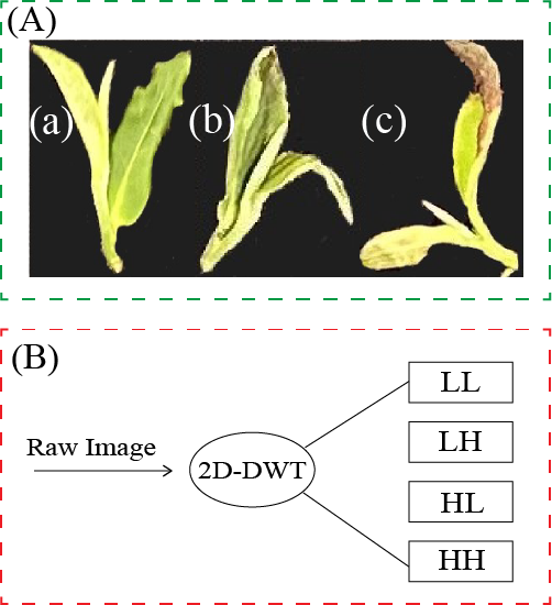 研究中,团队成员收集了受小绿叶蝉危害的不同程度的茶芽样本,并分别利用RGB和高光谱成像技术进行数据采集。对于RGB图像数据,通过数据增强及二维离散小波变换(2D-DWT)增强技术,有效提升了模型对图像特征的提取能力;而对于高光谱数据,则采用乘法散射校正(MSC)、Savitzky-Golay(S-G)平滑、一阶和二阶导数等预处理方法,并结合无信息变量消除(UVE)、竞争性自适应重采样(CARS)和连续投影算法(SPA)进行特征波段筛选,优化数据质量并减少冗余信息。