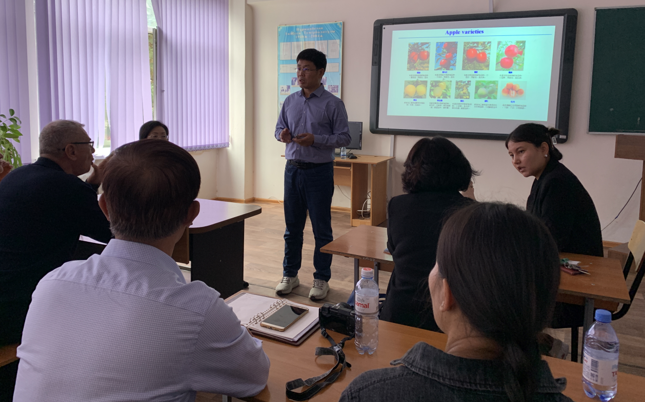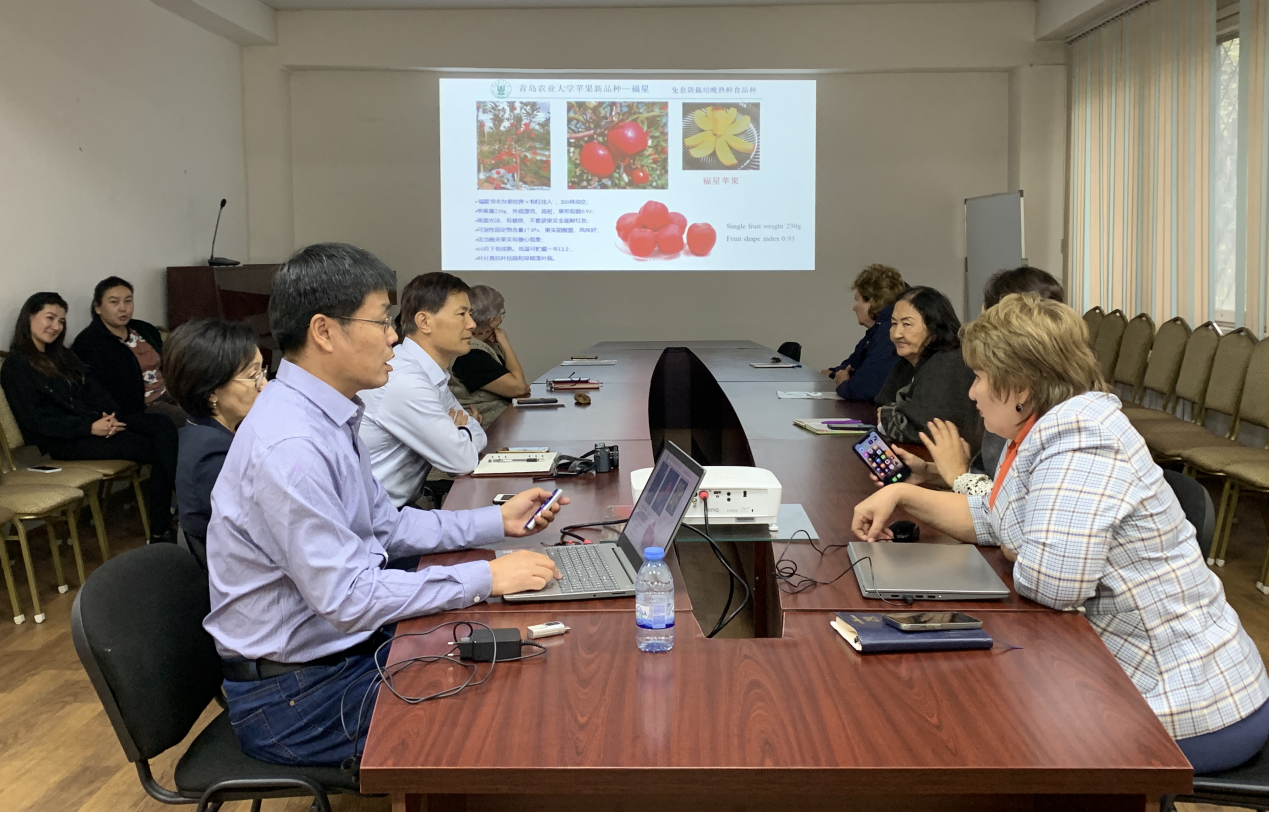 在访问哈萨克斯坦期间,会见了哈萨克斯坦国立农业大学农业生物学学院院长阿比尔达耶夫·叶尔詹(Abildayev Yerzhan)研究员、哈萨克斯坦农科院院士、哈萨克斯坦国立农业大学农业生物学学院园艺系凯罗娃·古尔沙利亚(Kairova Gulshariya)教授、园艺系主任、教研室主任、专业教师以及哈萨克斯坦农科院果蔬所所长、科研人员。围绕苹果野生资源评价与利用以及苹果抗病育种技术进行了交流,讨论了未来的国际合作。张玉刚教授作了“beat365亚洲体育官方网站苹果抗病杂交育种研究进展”的报告,并参观了该校与日本合作建立的生物技术研究中心实验室、学校实验站和苹果园。