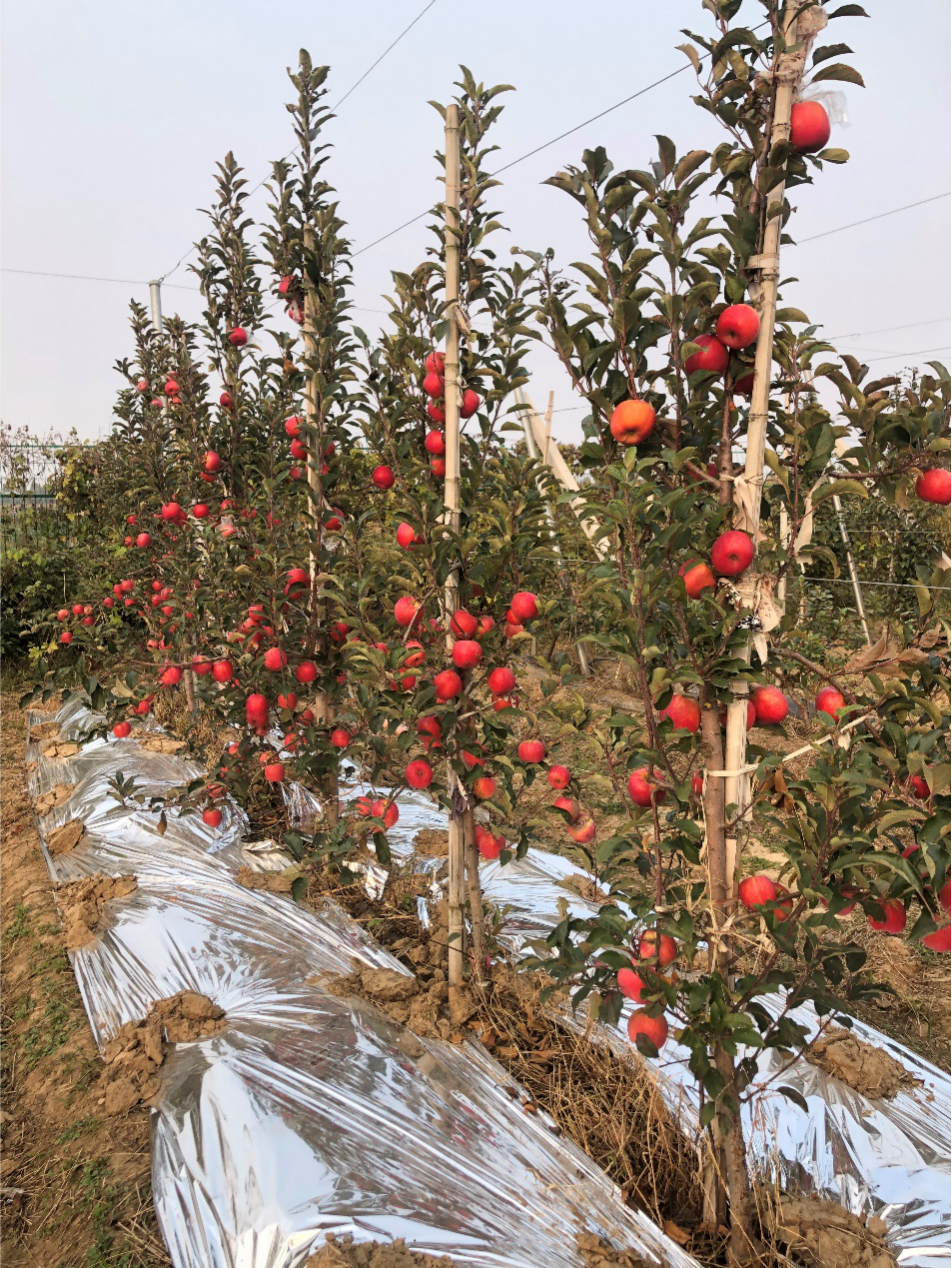 参会人员现场参观了平度市南村镇沙梁新村‘福星’示范基地及其他苹果新品种试验园。在‘福星’基地现场,国家苹果产业技术体系岗位科学家、山东省科技特派员、beat365亚洲体育官方网站张玉刚教授介绍了‘福星’选育过程和品种特性,并详细解答了观摩人员的现场提问。沙梁新村王恩忠书记介绍了该村苹果示范基地的建设情况以及从beat365亚洲体育官方网站引进的‘福星’、‘福美’、‘福丽’和‘福九红’等苹果新品种在当地的具体表现。该示范园2020年用一根杆矮化自根苗建园,栽植第二年开始挂果,第三年亩产3000斤左右,‘福星’田间表现高抗叶枯病和早期落叶病。