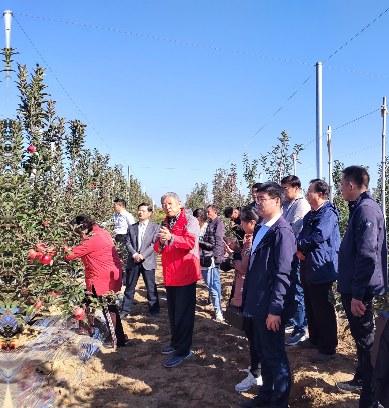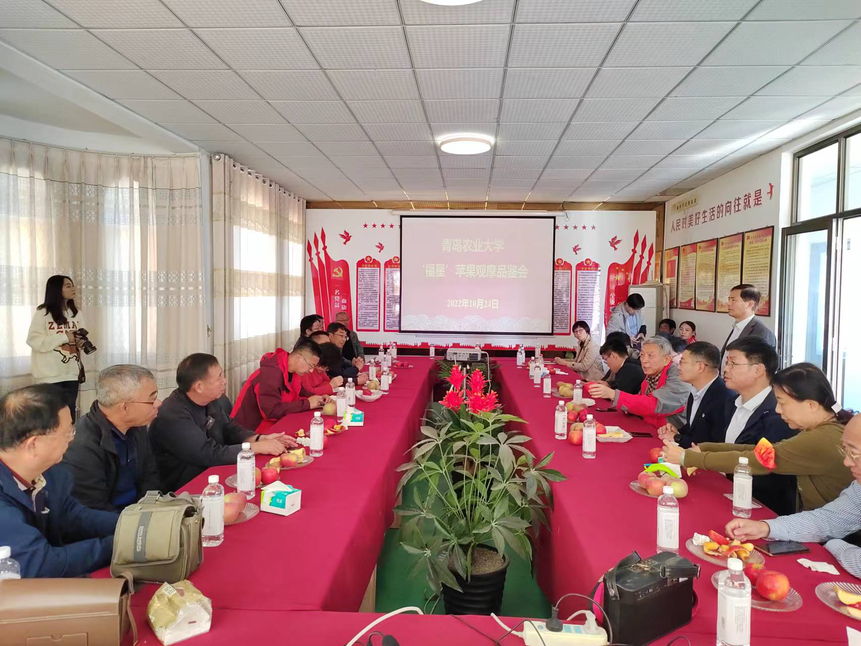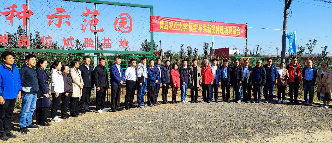 10月24日,beat365亚洲体育官方网站在学校苹果育种基地平度市南村镇沙梁新村召开晚熟苹果品种‘福星’现场观摩品鉴会。国家苹果产业技术体系岗位专家李保华教授、威海综合试验站站长曹洪建研究员、青岛综合试验站站长沙广利研究员和葛红娟副研究员、烟台农业技术推广中心主任吕常厚研究员、青岛农业技术推广中心副主任李松坚和郭江山研究员、潍坊学院生物与农业工程学院院长曹慧教授、平度市农业农村局赵克义站长、平度市南村镇相关领导、多家苗木和水果企业老总及企业代表、苹果种植大户及合作社技术人员、平度电视台和半岛都市报等多家媒体记者、beat365亚洲体育官方网站社会合作处王珏处长、beat365亚洲体育官方网站张忠华院长以及科技处、宣传部、beat365亚洲体育官方网站师生及苹果育种团队人员、当地果树技术人员共40余人参加本次观摩品鉴会。