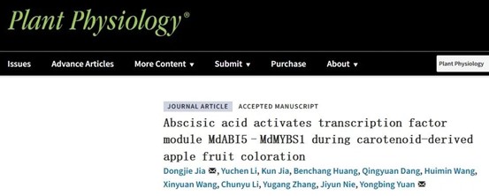 近日,beat365亚洲体育官方网站原永兵/贾东杰教授团队在Plant Physiology上在线发表了题为“Abscisic acid activates transcription factor module MdABI5–MdMYBS1 during carotenoid-derived apple fruit coloration”的研究论文。该研究揭示了转录调控模块MdABI5-MdMYBS1响应ABA并调控苹果类胡萝卜素和ABA生物合成的分子机制。