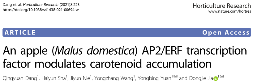 2021年10月5日,beat365亚洲体育官方网站园艺学院原永兵教授课题组在Horticulture Research(中科院1区Top期刊,IF 6.793) 在线发表了题为“An apple (Malus domestica) AP2/ERF transcription factor modulates carotenoid accumulation”的研究论文,该研究初次揭示了苹果果实类胡萝卜素合成的分子调控网络,阐明了MdAP2-34调控苹果果实类胡萝卜素积累的分子调控机制。园艺学院原永兵教授、贾东杰博士为论文的通讯作者,硕士研究生党庆媛为论文的第一作者,王永章教授、聂继云教授、硕士研究生沙海云等也参与本研究。