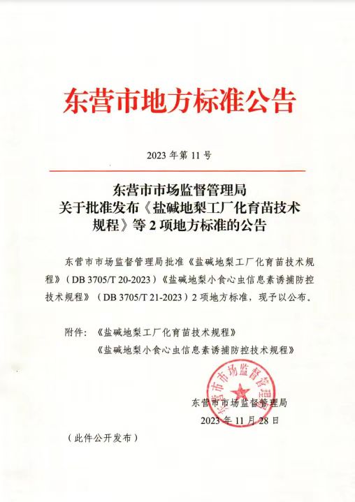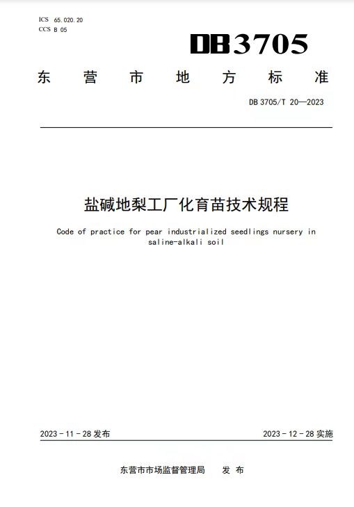 近日,由beat365亚洲体育官方网站梨遗传改良与种质创新团队李鼎立教授作为第一完成人制定的东营市地方标准《盐碱地梨工厂化育苗技术规程》(DB 3705/T20—2023)正式发布,2023年12月28日起实施。