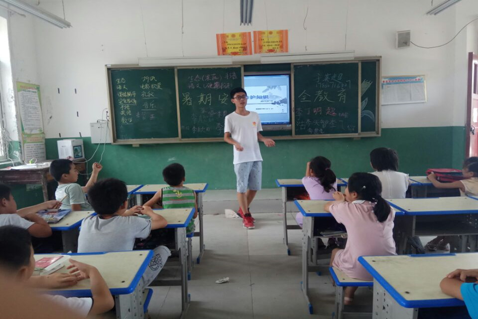 接下来我们正式开始教授我们准备好的课程,队员董翠娜给孩子们上了开学的第一节课——安全防护知识,上完课后的她又激动又惊喜。据她描述,当在黑板上写完字,回过头看到一个个端正的坐姿,一双双渴望的眼神,果然认真的孩子们都是最可爱的,心里说不出来的感动。