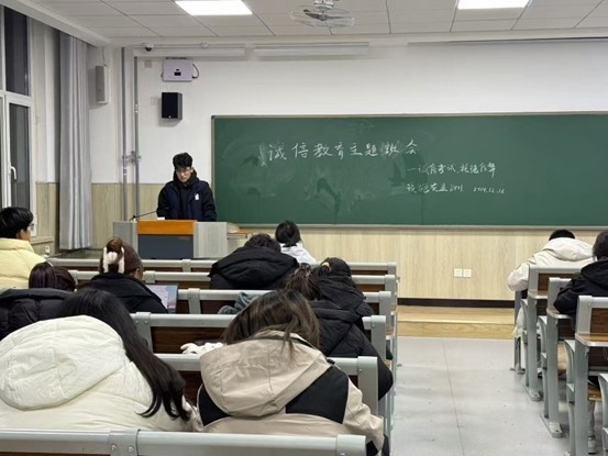 班会上,各班班长详细解读了学校发布的关于考试的各项规章制度,着重强调了诚信考试的重要性,并以实际案例向同学们展示了考试违纪行为带来的严重后果,让同学们深刻认识到诚信是大学生应始终坚守的道德底线。