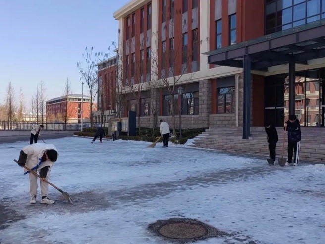 2月27日,平度校区志愿者在大学生活动中心楼前扫除积雪。同学们从大门方向开辟一条路,进而从线到面,由主及次,逐步完成任务。大家分工明确,部分同学负责打水,浸润冰层,部分同学负责开辟主道路,其余同学负责对周围区域进行大面积清刮。