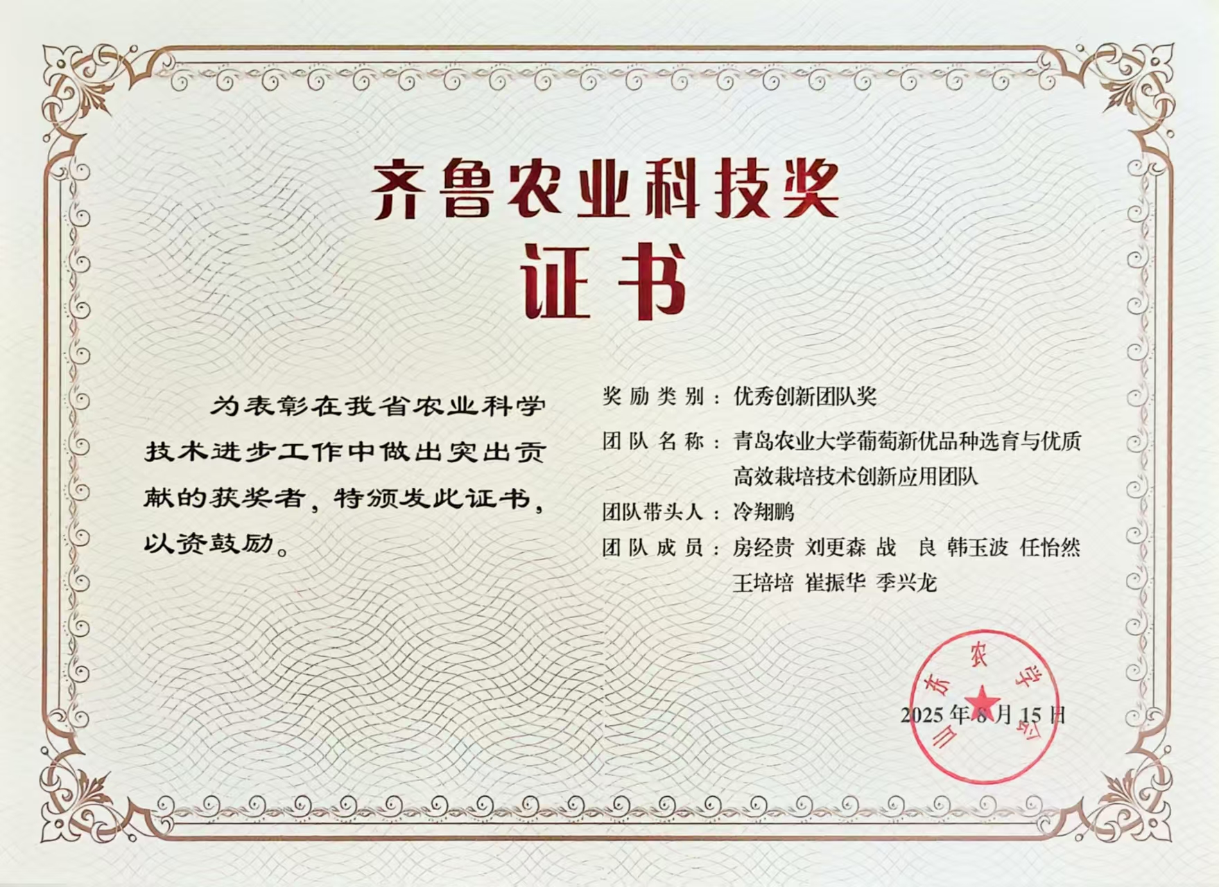 beat365亚洲体育官方网站葡萄新优品种选育与优质高效栽培技术创新应用团队围绕葡萄产业高质量发展,构建了集重要农艺性状调控机理研究、新品种选育、良种良苗生产、高效栽培技术研发与推广于一体的“研育繁推”葡萄全产业链体系。该团队显著推动了葡萄产业的提质增效与可持续发展,有效提高了农民的经济收入,取得了显著的经济效益、社会效益和生态效益。此次获奖是葡萄科学与工程团队继2023年度山东科技兴农奖优秀项目奖一等奖之后的再次获奖,表明该团队持续为葡萄产业的高效发展贡献着“青农力量”。