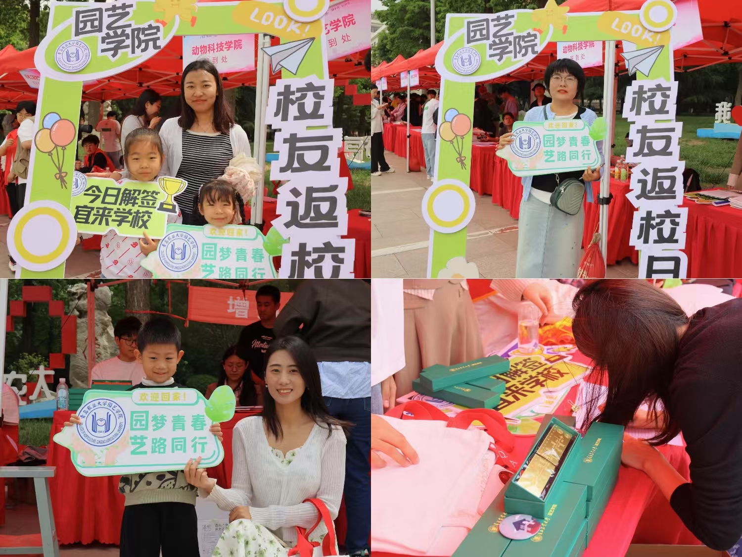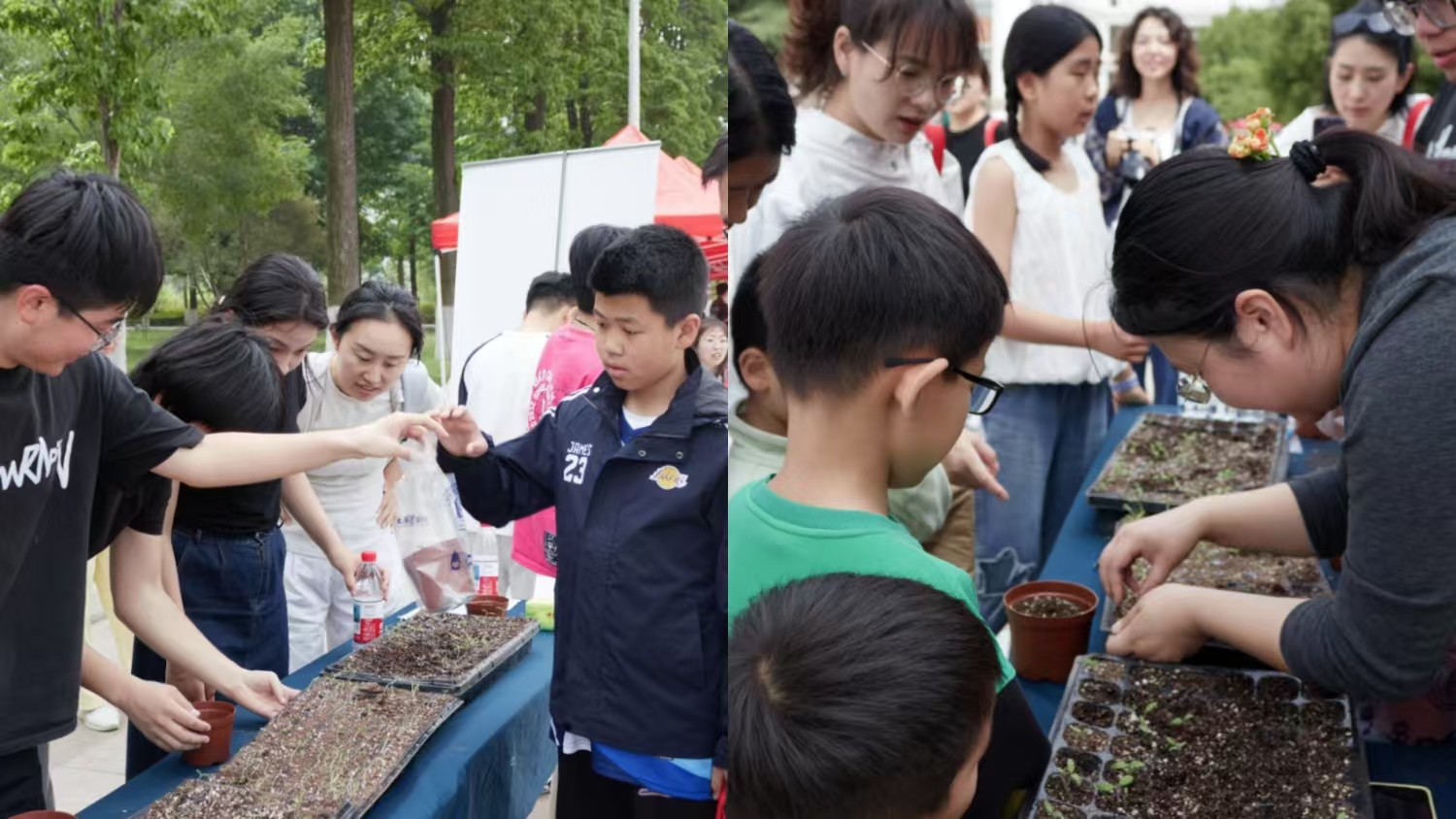 在完成签到程序后,校友们齐聚于虹子广场,参与“绿意盎然,心灵舒展”盆栽制作活动。学院方面提供了包括小番茄、洋甘菊等多种幼苗以及园艺工具,供校友们亲手进行培土和栽种,从而制作出独一无二的绿植盆栽。这些生机勃勃的新绿植株不仅展现了园艺学科的独特魅力,也使校友们在亲自动手的过程中重温了往昔的校园生活。在活动现场,校友们络绎不绝,其中不乏携带子女的校友,他们满怀激情地向孩子们传授自己在校园中所学的知识,回忆往昔的课堂时光,不仅感染了孩子,也触动了所有在场的在校生。