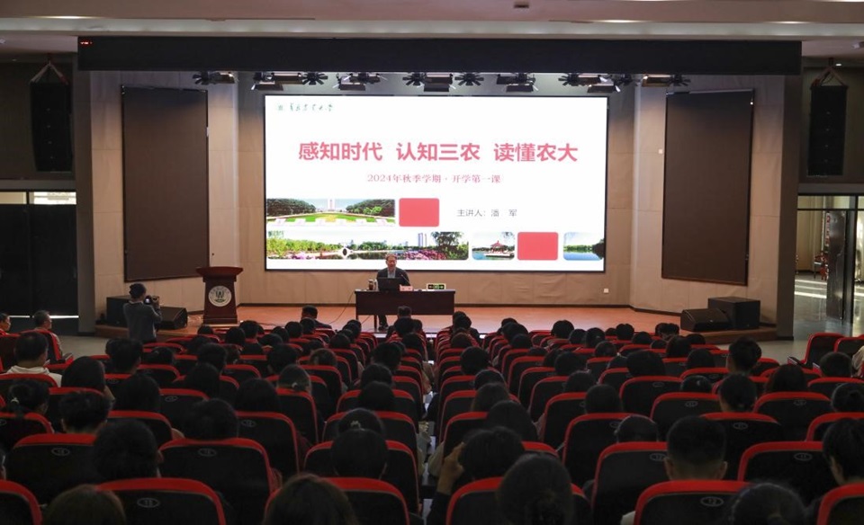 潘军首先向同学们系统介绍了何为大学、在大学学什么;进而围绕何为农业详细介绍了现代农业的发展变化,阐述了农业是社会主义现代化强国的基础支撑、是满足人民美好生活需要的必然要求、是应对世界百年未有之大变局的迫切需要,并着重讲解了现代农业“基因化”、“工程化”、“绿色化”、“营养化”、“智能化”等五大特点,强调了农科大学生肩负的强农兴农责任和使命。随后,他从我校的基本概况、学校发展史上的主要社会贡献、服务国家重大战略情况、学校发展历程、文化精神、杰出校友以及雄厚的师资力量,展现了学校发展的辉煌成就和光明前景,鼓励同学们尽快完成从高中到大学的角色转变,增强对学校的归属感和自豪感。最后,他勉励到场同学,要做坚定理想信念,做志向远大的青农人;要砥砺品格意志,做品行正大的青农人;要敏于求真求知,做学问博大的青农人;要奋楫笃行争先,做担当重大的青农人;要团结融通协同,做视野宽大的青农人;要坚毅自信宽和,做自我强大的青农人。他希望同学们牢记习近平总书记的殷切嘱托,以民族复兴为己任,厚植“知农爱农”情怀,涵养进取品格,坚守初心,不负时代,不负韶华,以奋斗姿态激扬青春,在乡村振兴的大舞台上建功立业。