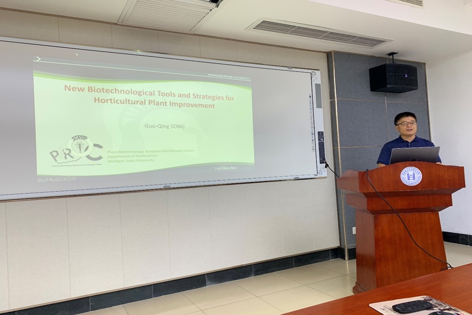 7月2日,美国密西根州立大学园艺系教授、植物生物技术资源与推广中心主任宋国庆博士来到beat365亚洲体育官方网站进行学术交流,在学院会议室为师生做了“基因组学和基因编辑时代园艺植物改良的生物技术新工具和策略”的学术报告,报告由学院副院长张新富主持,祝军教授、张玉刚教授、beat365亚洲体育官方网站和生命科学学院的教师和研究生代表参加了会议。