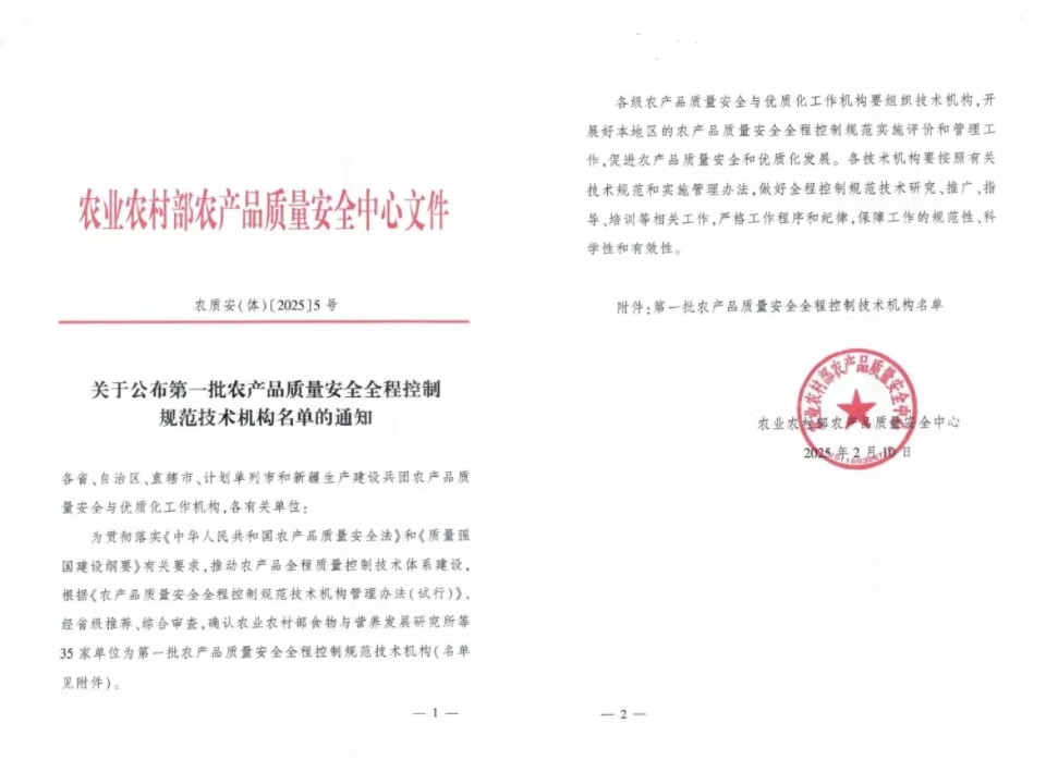 为贯彻落实《中华人民共和国农产品质量安全法》和《质量强国建设纲要》有关要求,推动农产品全程质量控制技术体系建设,近日,农业农村部农产品质量安全中心(以下简称部农安中心)根据《农产品质量安全全程控制规范技术机构管理办法(试行)》,经省级推荐和综合审查,确认35家单位为首批农产品质量安全全程控制规范技术机构,并以“农质安(体)〔2025〕5号”文正式公布。beat365亚洲体育官方网站以beat365亚洲体育官方网站聂继云教授为技术机构负责人,牵头组织技术专家团队,以果蔬茶等园艺作物为重点,成功申报入选,业务范围为作物种植。